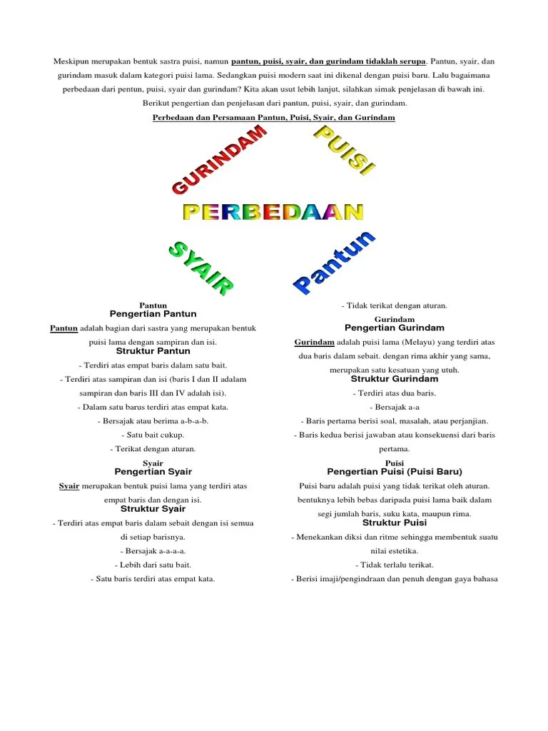 Perbedaan dan persamaan pantun,gurindam dan syair dalam bentuk … tuliskan 5 persamaan pantun syair dan gurindam | cikimm.com perbedaan . Struktur pantun terdiri atas empat baris dalam satu bait. Berikut adalah pengertian dan persamaan pantun, syair, dan gurindam yang merupakan bentuk karya sastra. Pantun terdiri dari sampiran (baris pertama dan kedua) dan isi (baris ketiga dan keempat); Maksudnya, semua baris yang jumlahnya ada empat berisi ajaran dan pesan yang memiliki muatan positif.